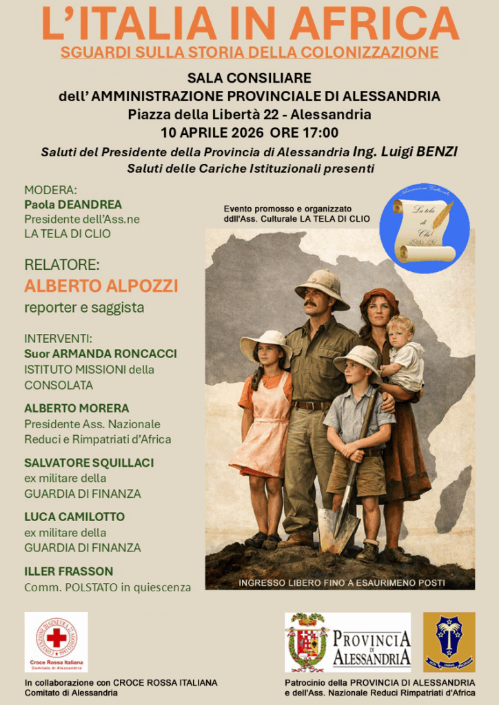 Venerdì 10 aprile alle ore 17.00, nella Sala Consigliare della Provincia di Alessandria si svolgerà la conferenza “L’Italia in Africa – Sguardi sulla storia della colonizzazione” tenuta da Alberto Alpozzi, autore della trilogia “Bugie Coloniali”, organizzata dall’associazione culturale La Tela di Clio, da sempre impegnata nella diffusione della Storia patria e dei valori del Patrimonio Culturale italiano.