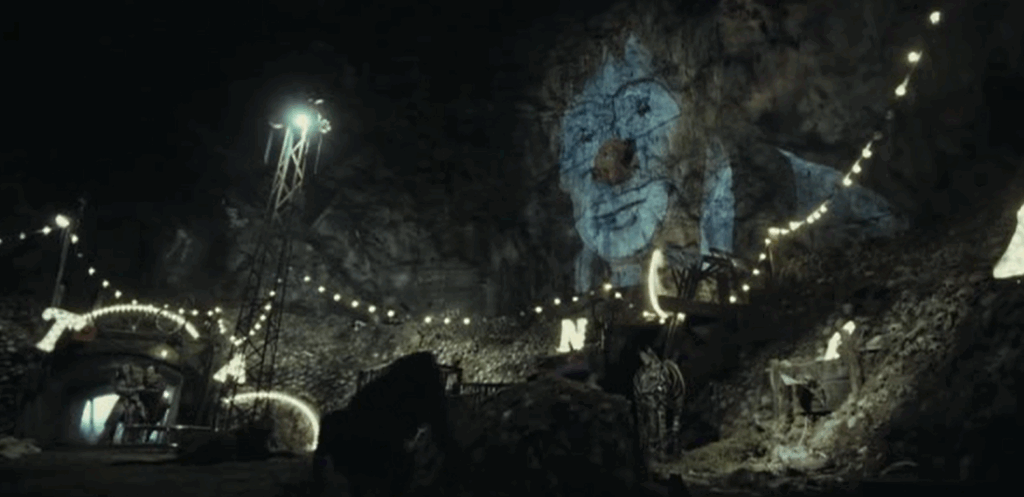 Il clown triste porterà la bella acrobata inseguiti dal clown violento a Los Caidos. Una ricostruzione in digitale fedele, con l’eccezione delle fantasiose gallerie sotterranee fatte di muragli di teschi e ossa. Il finale sarà proprio sulle braccia della croce, dopo un’arrampicata stile King Kong sulle teste degli evangelisti.
