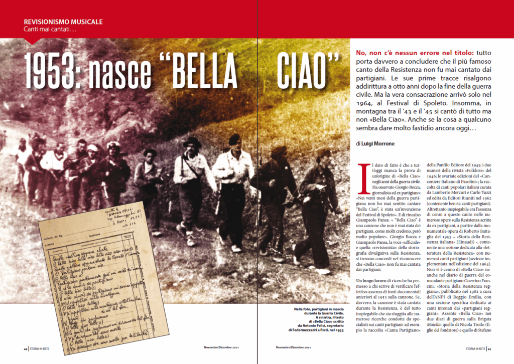 No, non c’è nessun errore nel titolo: tutto porta davvero a concludere che il più famoso canto partigiano non fu mai cantato dai partigiani. Le sue prime tracce risalgono addirittura a otto anni dopo la fine della guerra civile ma la vera consacrazione arrivò solo nel 1964, al Festival di Spoleto. Insomma, in montagna tra il ’43 e il ’45 si cantò di tutto ma non «Bella Ciao». Anche se la cosa a qualcuno sembra dare molto fastidio ancora oggi…