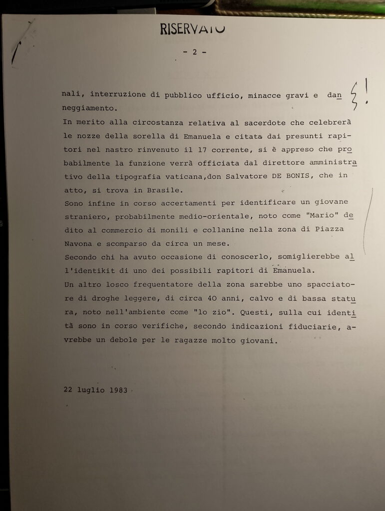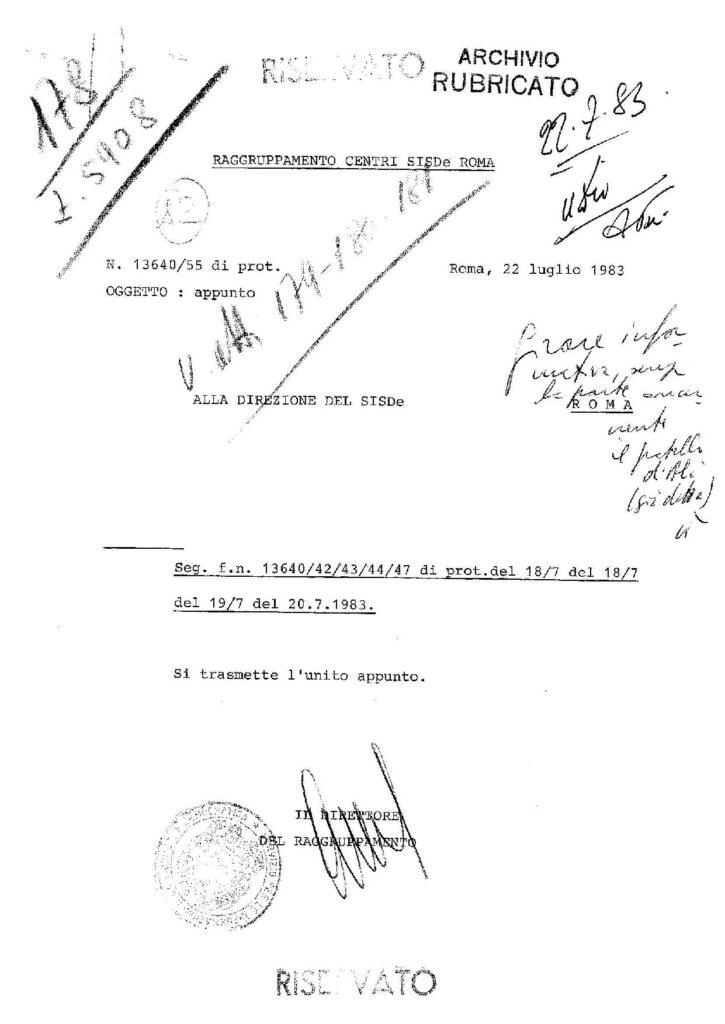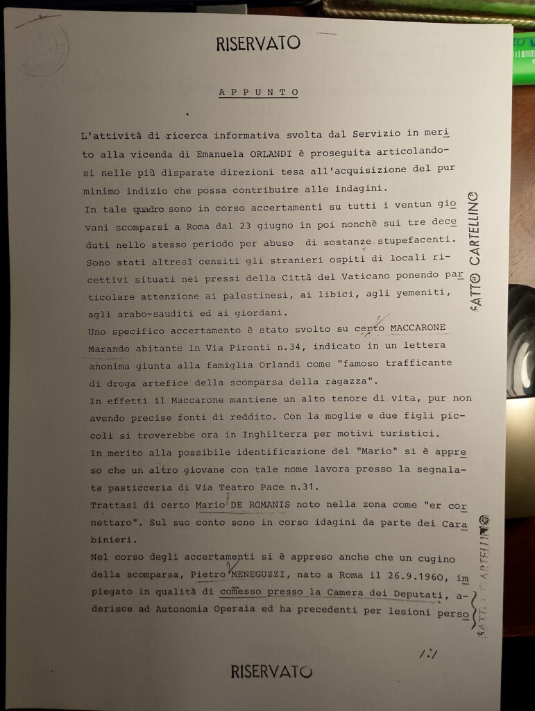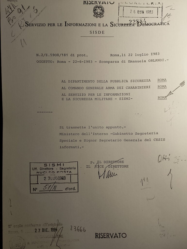 Fra questi documenti c’è un appunto, risalente al 22 luglio 1983, prodotto dal Raggruppamento Centri SISDE di Roma indirizzato alla direzione del Servizio nel quale veniva riassunta una serie di attività info-operative sulla vicenda Orlandi.