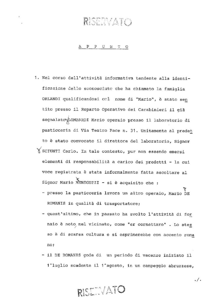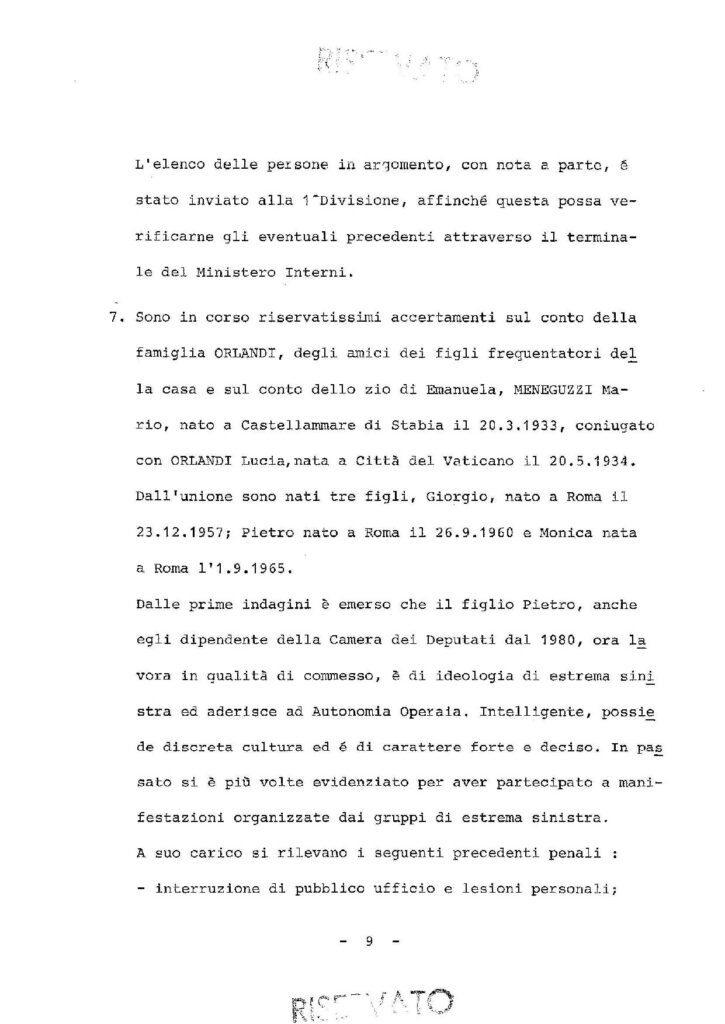 «Sono in corso riservatissimi accertamenti sul conto della famiglia Orlandi, degli amici dei figli frequentatori della casa e su conto dello zio di Emanuela, Meneguzzi Mario, nato a Castellammare di Stabia il 20.3.1933, coniugato con Orlandi Lucia, nata a Città del Vaticano il 20.5.1934. Dall’unione sono nati tre figli, Giorgio, nato a Roma il 23.12.1957; Pietro, nato a Roma il 26.9.1960 e Monica, nata a Roma l’1.9.1965».