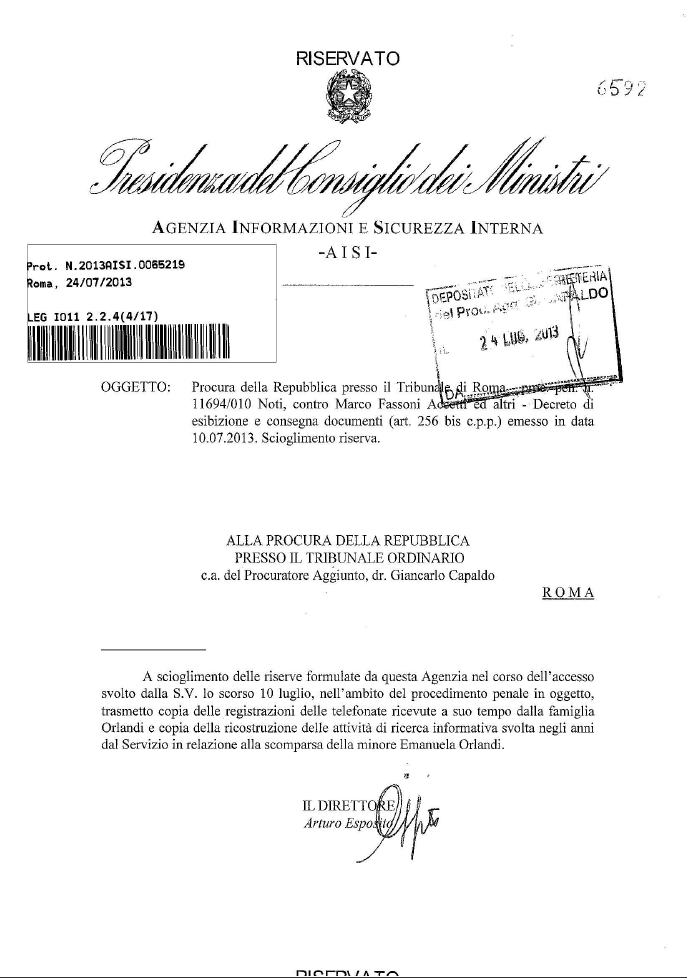 E così in quasi tutte le redazioni è scattata l’ansiogena attesa della puntata de “Lo stato delle cose” per vedere questo benedetto documento dei servizi segreti italiani con le «pagine strappate». Lunedì sera, dopo un lunghissimo (e rissoso) slot dedicato al guazzabuglio di Garlasco (delitto di Chiara Poggi), finalmente Giletti – con fare ieratico – agitava fugacemente davanti alle telecamere la nota di trasmissione di una serie di atti dell’allora SISDE, firmata dal direttore pro tempore dell’AISI, generale Arturo Esposito, risalente al 24 luglio del 2013, e indirizzata alla Procura della Repubblica di Roma, all’attenzione del procuratore aggiunto Giancarlo Capaldo. L’AISI, «a scioglimento delle riserve formulate» nel corso dell’accesso agli atti svolto dallo stesso Capaldo due settimane prima (il 10 luglio) presso la sede dell’Agenzia, trasmetteva formalmente copia della documentazione richiesta dal magistrato.